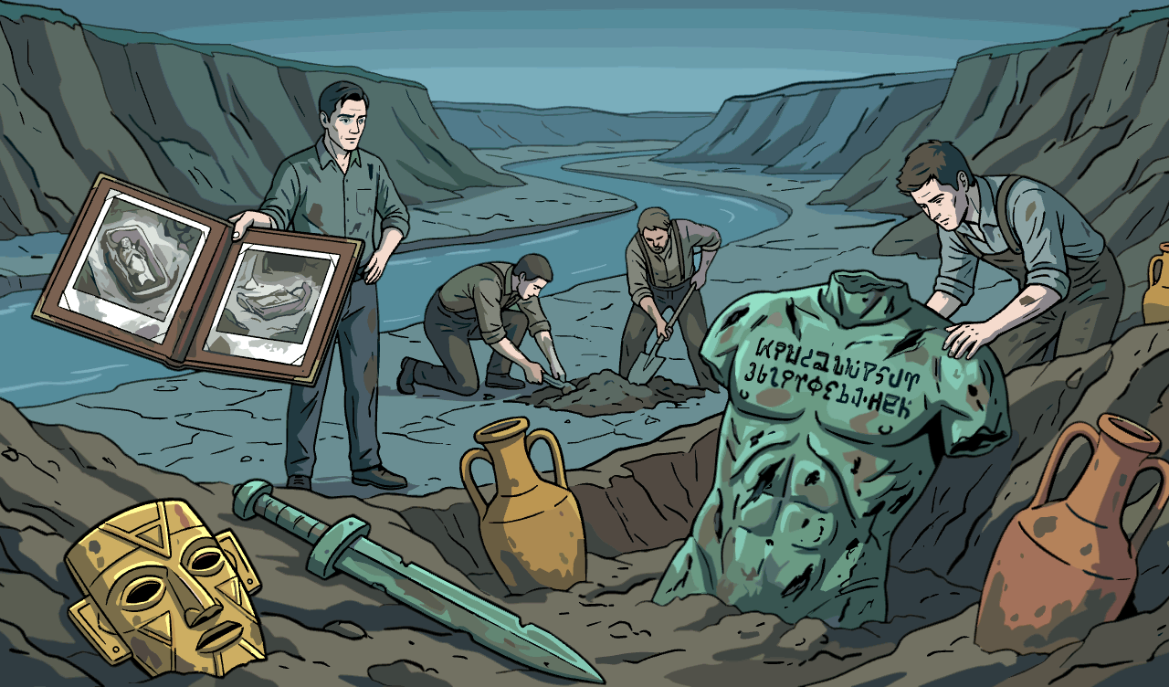 In three the failure was almost total; in the fourth (whose director happened to die during the first excavations) the disciples unearthed - or produced - a gold mask, an archaic sword, two or three clay amphoras and the greenish and mutilated torso of a king with an inscription on his chest which has not yet been deciphered. .i ci da zo'u le ve ckule be da cu gasnu lo cipra poi nu so'a va'e lo ka fliba .i le ve ckule be fo le vo moi noi le jatna be ke'a ze'a le nu so'u moi nu kakpa kei co'a morsi cu tolse'a gi'a va'i cupra vau le solji firgai fe le tcelaldo cladakfu fe lei kliti amfora ku noi re mei gi'a cimei ku'o fe ro mai le noi milxe crino gi'e korcu ku'o torso be le nolraitru be'o noi da se ciska fi le betfu be ke'a gi'e mifra lo na te djuno En tres fue casi total el fracaso; en el cuarto (cuyo director murió casualmente durante las primeras excavaciones) los discípulos exhumaron -o produjeron- una máscara de oro, una espada arcaica, dos o tres ánforas de barro y el verdinoso y mutilado torso de un rey con una inscripción en el pecho que no se ha logrado aún descifrar. В трёх неудача была почти полной; в четвёртой (начальник которой случайно умер во время первых раскопок) ученики выкопали — или создали — золотую маску, архаичный меч, две или три глиняные амфоры и зеленоватый изуродованный торс царя с надписью на груди, которая до сих пор не расшифрована. Dans trois l'échec fut presque total ; dans le quatrième (dont le directeur mourut fortuitement pendant les premières fouilles) les élèves exhumèrent – ou produisirent – un masque d'or, une épée archaïque, deux ou trois amphores d'argile et le torse verdâtre et mutilé d'un roi portant sur la poitrine une inscription qu'on n'a pas encore réussi à déchiffrer. En tri el ili, la malsukceso estis preskaŭ tuta; en la kvara (kies direktoro mortis hazarde dum la unuaj elŝiradoj), la lernantoj elĉerpis - aŭ produktis - oran maskon, arkaikan glavon, du aŭ tri argilajn amforojn, kaj verdan kaj mutilitan torson de reĝo kun enskribo sur la brusto, kiu ankoraŭ ne estas sukcese deĉifrita.