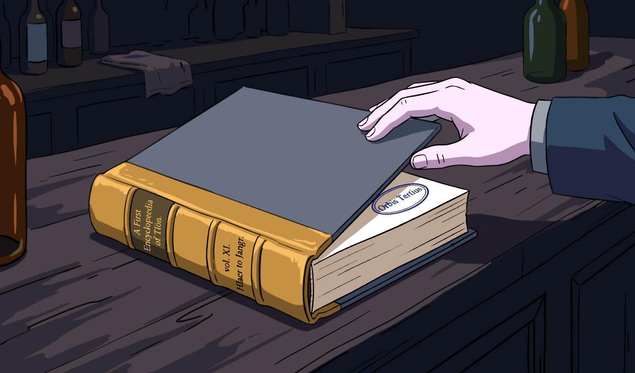 The twenty volumes of the Encyclopaedia Britannica were then in circulation; Buckley suggests a methodical encyclopedia of the illusory planet. .i ca le di'u cerda so'i prenu cu tcidu fi le re no slecku be la brito skecku .i la baklis. stidi lo ka zbasu le skecku be le noi satci gi'e se platu ku'o ve ciksi be le xanri munje Circulaban entonces los veinte tomos de la Encyclopaedia Britannica; Buckley sugiere una enciclopedia metódica del planeta ilusorio. В то время в обращении находились двадцать томов Encyclopaedia Britannica; Бакли предлагает методическую энциклопедию иллюзорной планеты. Les vingt tomes de l'Encyclopœdia Britannica circulaient alors ; Buckley suggère une encyclopédie méthodique de la planète illusoire. Tiam cirkulis la dudek volumoj de la Encyclopaedia Britannica; Buckley sugestas metodikan enciklopedion de la iluzora planedo.